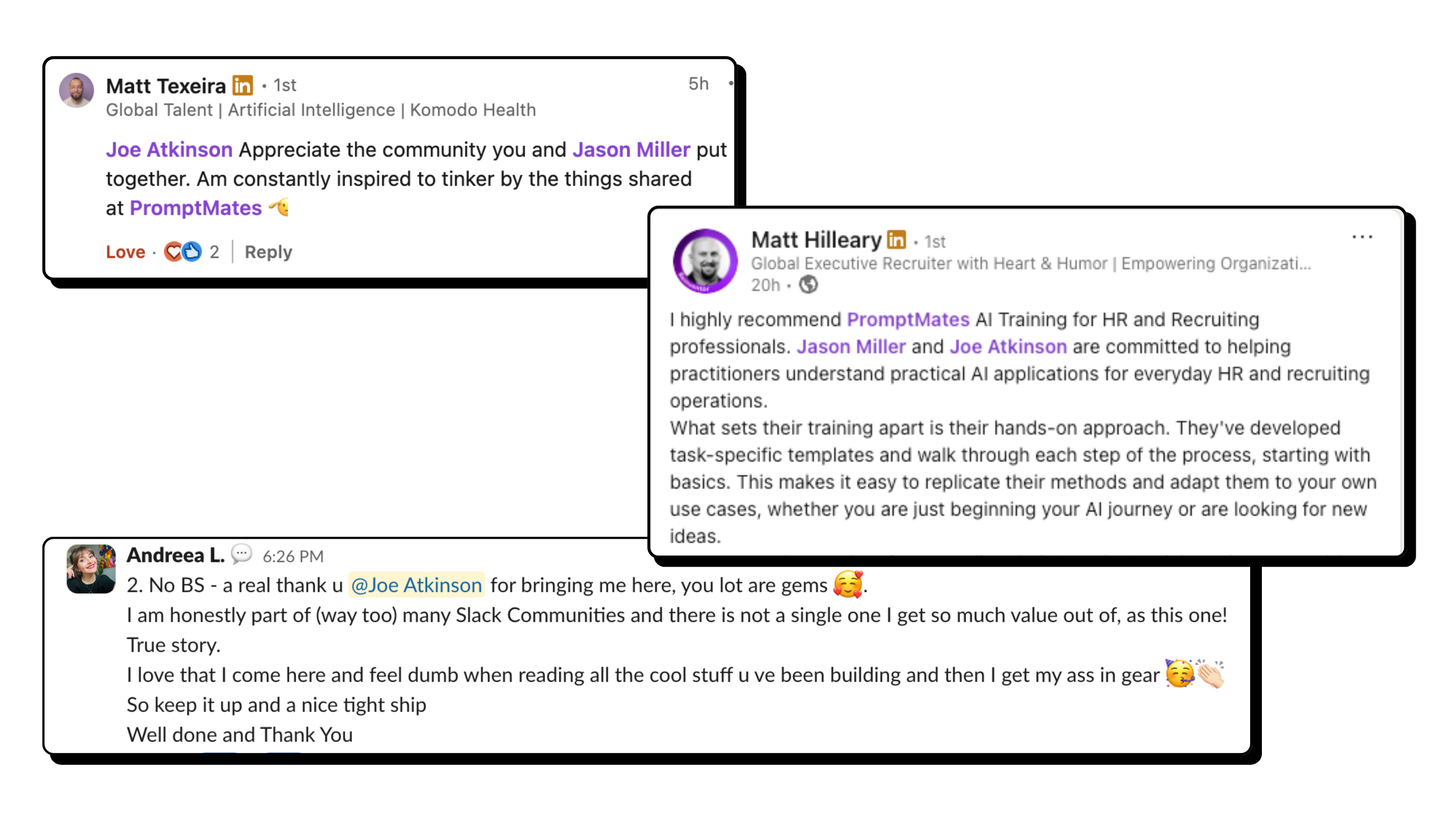 PromptMates members don’t just learn about AI, they implement itOur community gives TA leaders the structure, support, and peer accountability to move from “exploring AI” to delivering measurable results across their teams