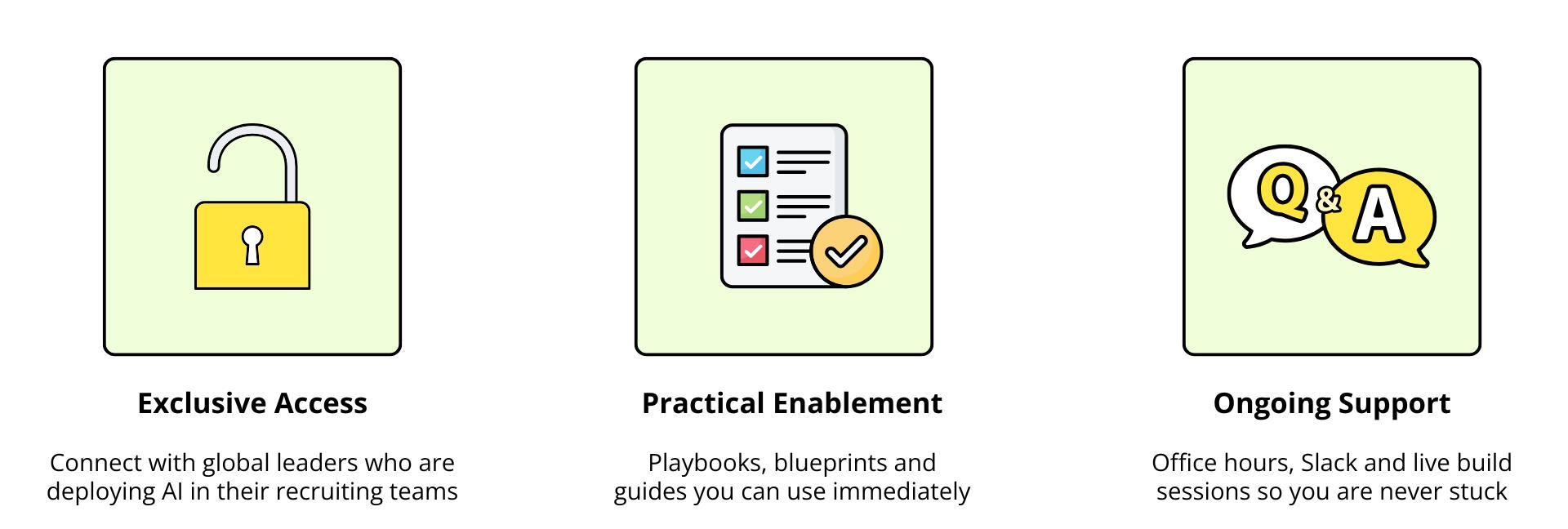 The only private community giving recruiting leaders access to AI experts, peer support, and plug-and-play resources to implement AI in hiring